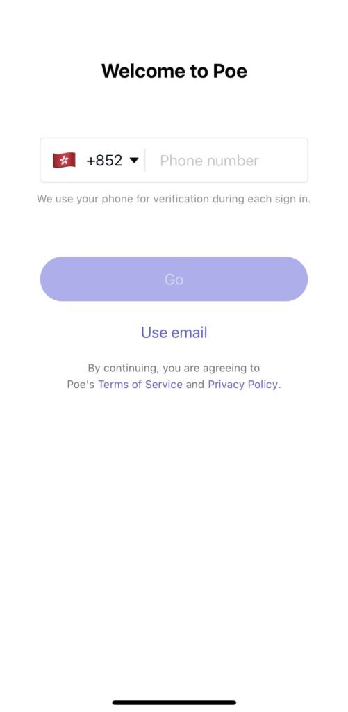 下載後開啟Poe,第一步以你的手機號碼註冊 (區號選+852),收到驗証碼短訊後輸入並按”Verify”。第二步是輸入你的電郵地址,然後到你的郵箱開啟Poe發給你的驗證碼並回到Poe app輸入驗證碼。註冊完成!立即可以與人工智能展開對話!