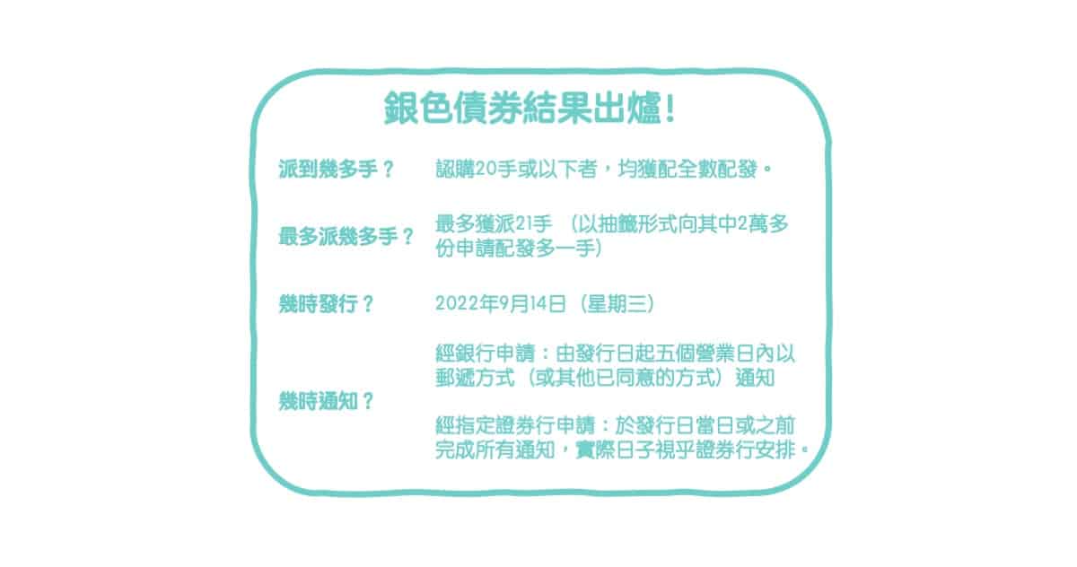 銀色債券將於2022年9月14日發行。申請人將按發行通函中所列出的時間表,獲個別通知其配發的結果、適用的認購款項,以及申請款項中任何退款的金額。